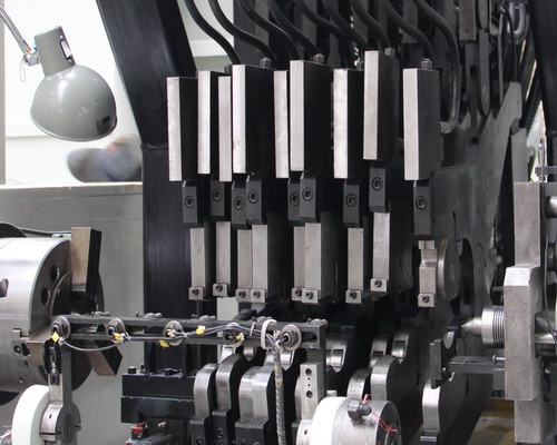 機(jī)床一次裝夾可實現(xiàn)曲軸所有主軸頸、連桿頸上的沉割槽圓角滾壓、在線測量、滾壓校直的自動加工全過程,工作效率高,勞動強(qiáng)度低,調(diào)整方便,機(jī)床采用懸掛式九鉗結(jié)構(gòu)系國內(nèi)外首創(chuàng),突破了導(dǎo)軌式曲軸圓角滾壓機(jī)床目前只設(shè)置5個滾壓鉗的局限。